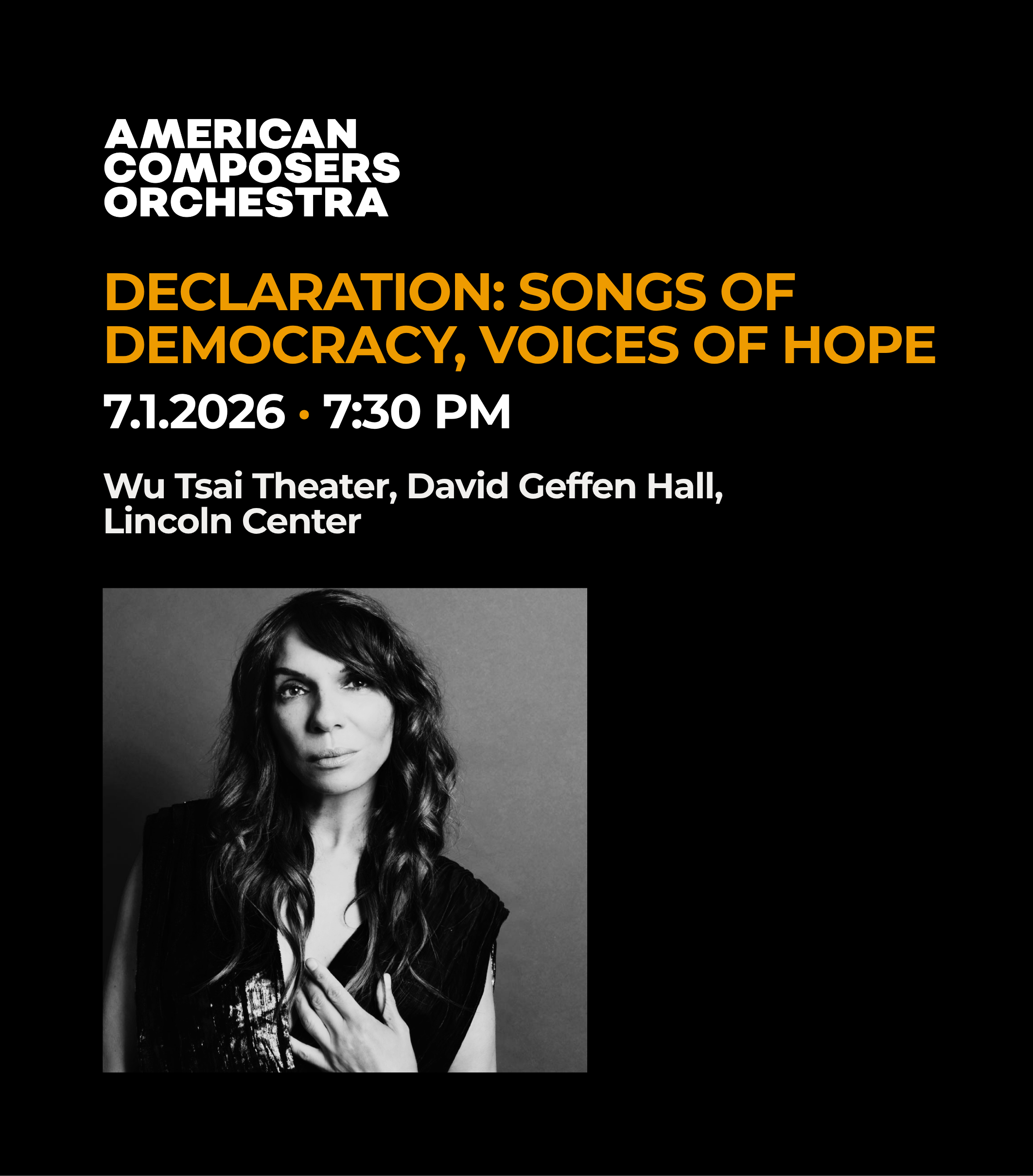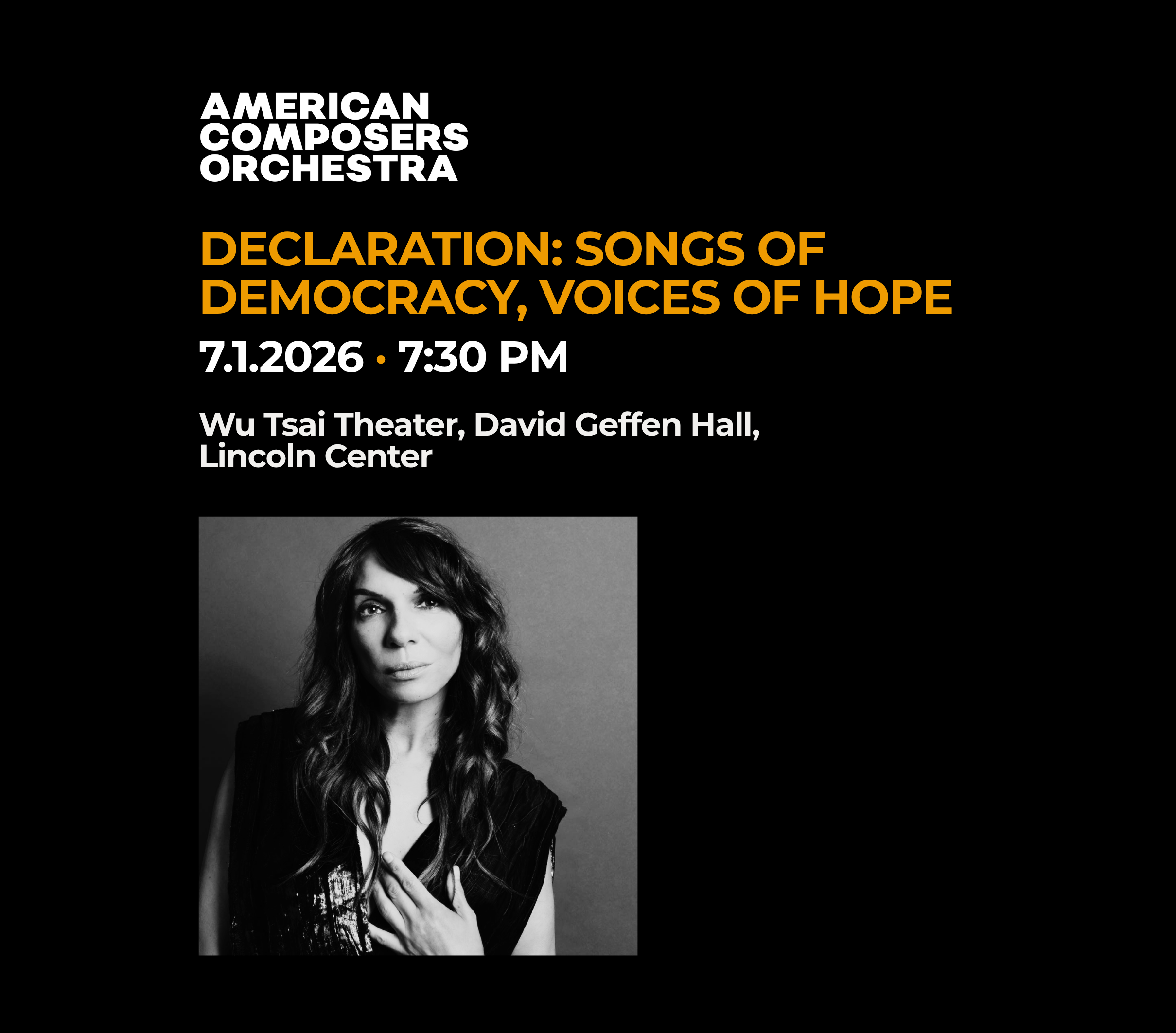 What does it mean to be an American today? That is the question posed by the curator, pianist and producer Lara Downes in Declaration: Songs of Democracy, Voices of Hope, featuring world premieres by three major composers. Valerie Coleman presents Life, a work for solo piano; Arturo O'Farrill offers the Liberty; and Christopher Tin closes with The Pursuit of Happiness. These latter two compositions are performed by the American Composers Orchestra, under the baton of Eric Jacobsen, with the aid of a select collective of artists and bands who represent a wide range of the American experience. Guests will include jazz bassist Christian McBride, vocalists Kurt Elling and Aoife O’Donovan, and more to be announced.