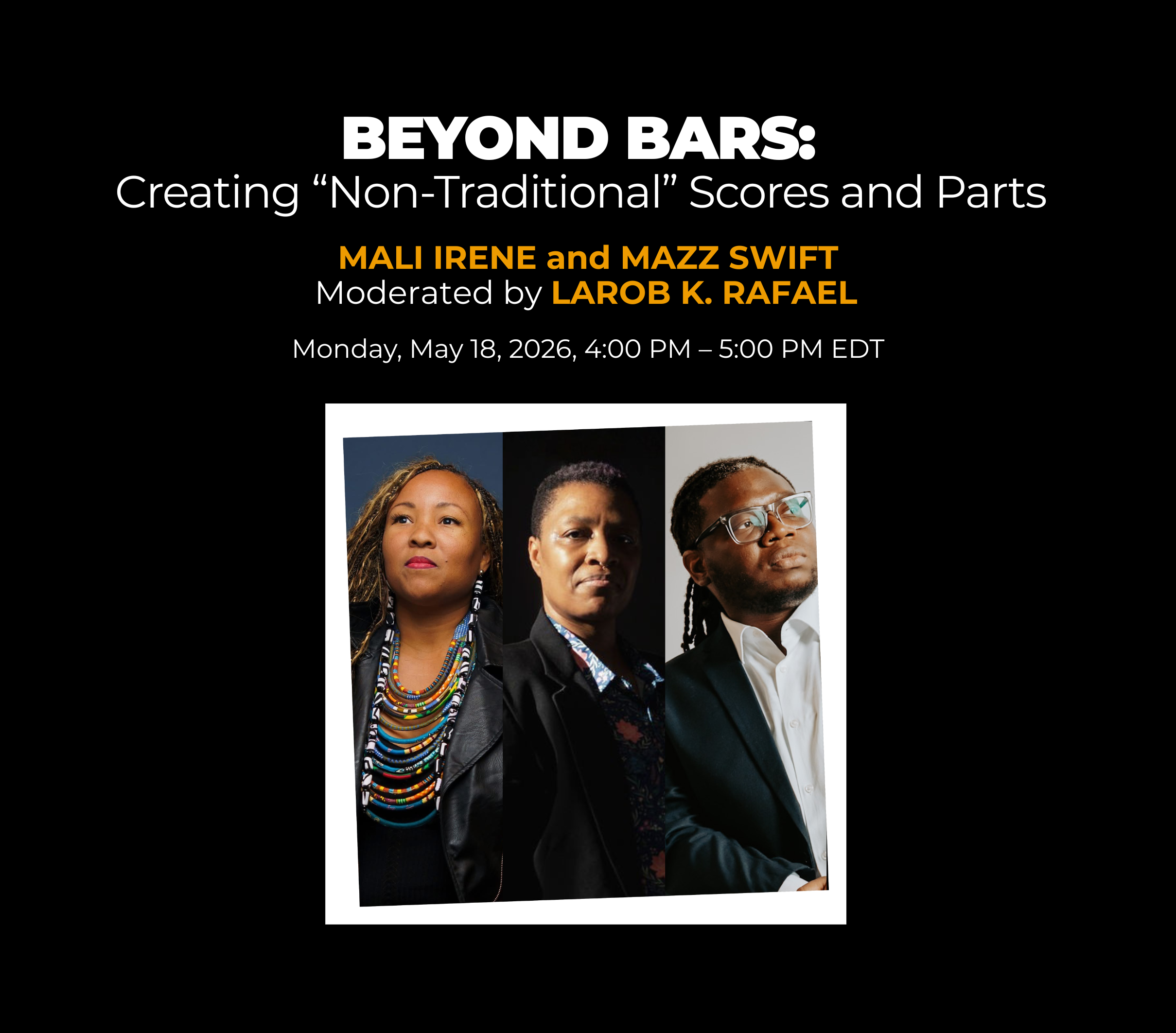 While creating and providing standard orchestral scores and parts remains a key component of being a broadly performed composer, more ensembles are increasingly exploring graphic notation and improvised scores. LaRob K. Rafael, Director of Composer Advancement at the American Composers Orchestra, will be joined by composers Mazz Swift and Mali Irene for a dynamic conversation on how
